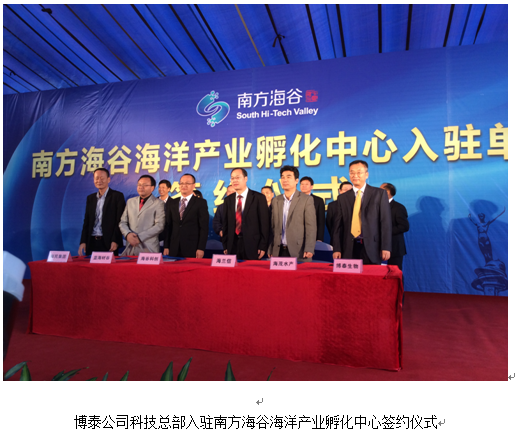 2016年11月24日廣東省科技廳葉景圖廳長、廣東省科學(xué)院李定強(qiáng)院長、湛江市王中丙市長對(duì)廣東省科學(xué)院與博泰公司展開全方位合作做了重要講話與指示,做為南方海谷首批入園成員單位對(duì)博泰公司科技創(chuàng)新能力及產(chǎn)業(yè)發(fā)展給予了高度評(píng)價(jià)也對(duì)博泰公司發(fā)展提出了新的要求和期望。博泰公司科技總部入駐南方海谷海洋產(chǎn)業(yè)孵化中心,博泰將在這里揚(yáng)帆起航,再創(chuàng)博泰輝煌。