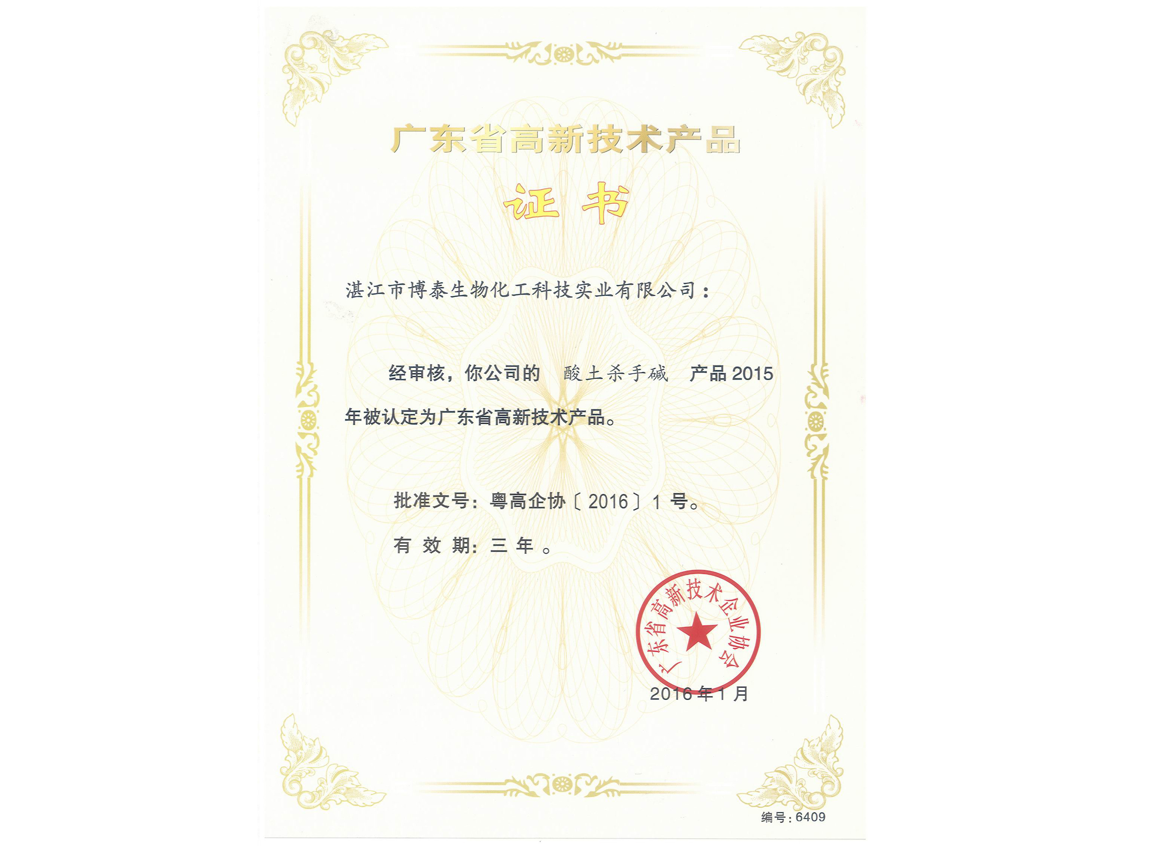 2016年伊始,我司便取得了開門紅,先后獲得由廣東省高新技術(shù)企業(yè)協(xié)會頒發(fā)的兩個“廣東省高新技術(shù)產(chǎn)品”證書——“酸土殺手堿”和“蝦肽蝦紅素”。