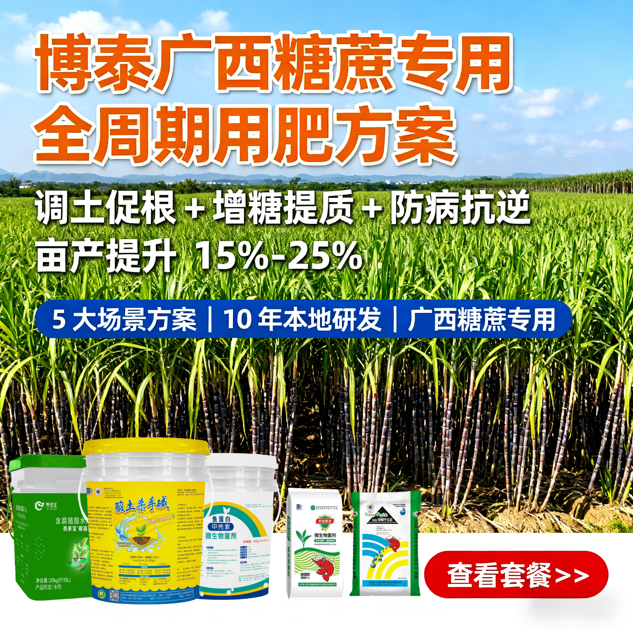 廣西糖蔗種植常見難題,一套方案全解決: 酸性紅壤板結(jié):土壤 pH 值偏低,根系難下扎,吸肥效率差 重茬障礙:連作地塊病害多,出苗率低,長勢參差不齊 水肥流失快:雨季養(yǎng)分淋溶,干旱時(shí)缺水缺肥,作物易早衰 分蘗少莖稈弱:后期易倒伏,有效莖數(shù)不足影響產(chǎn)量 糖分積累不足:成熟度不夠,收購價(jià)低,收益縮水 博泰生物深耕廣西糖蔗種植需求,針對(duì)酸性土壤、氣候特點(diǎn)及糖蔗生...